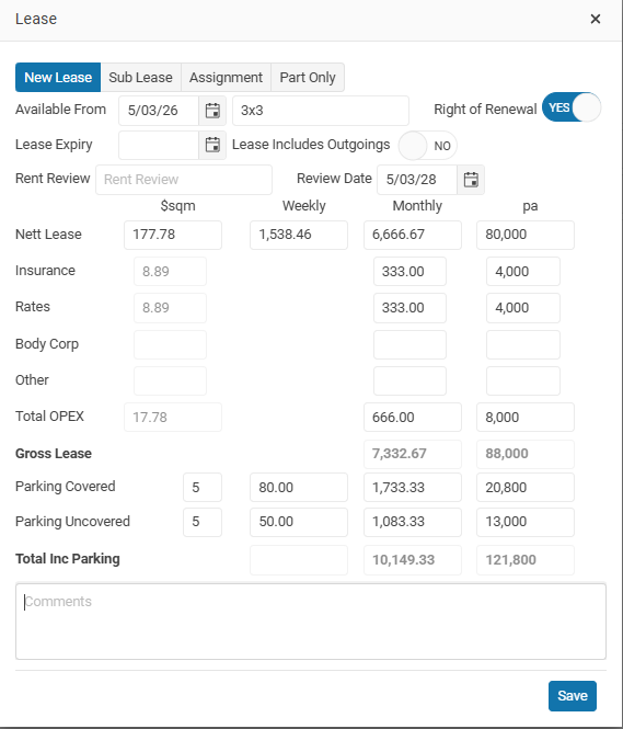 You can enter either the $ per sqm, Weekly, Monthly or the per annum Lease amount.